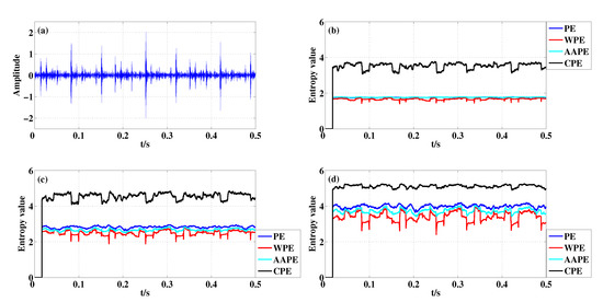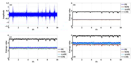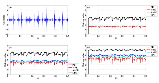 Figure 11. Detecting abnormal pulse existing in BF signal with different m using PE, WPE, AAPE, and CPE: (a) The BF signal; (b) m = 3 , τ = 1 ; (c) m = 4 , τ = 1 ; (d) m = 5 , τ = 1 .