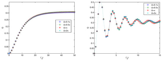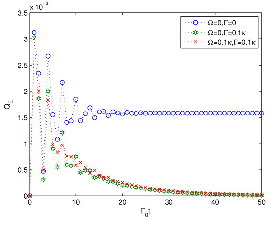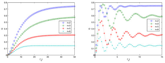 where n is the size of the system. is the linear entropy of the ith qubit and the linear entropy is expressed as . Since the linear entropy of one subsystem of a pure state is an entanglement monotone [86] (it does not increase under local operations and classical communication), and is a valid entanglement measure. A concave function of the linear entropy is also an entanglement monotone. Therefore, the average linear entropy Q is an entanglement monotone and can be employed to study the multipartite entanglement generation. Here, in slight contrast to the definition in [85], we consider only the multipartite entanglement of the n-qubit system and do not take the linear entropy of the environment into account because the multipartite entanglement of the n-qubit system should be examined independently. For instance, given a W-type state with a size of 5, the linear entropy takes a value of 0.4. Through calculation, we get the linear entropy of the n-qubit quantum states by tracing the degrees of freedom of the structured environment off the composite state in Equation (5) in the following expression: