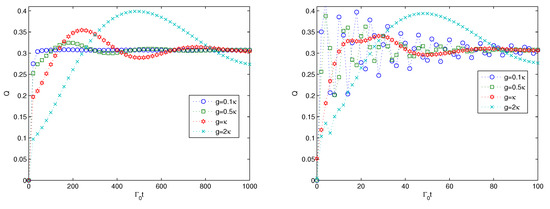 Next, we consider the effect of the coupling strength g between the 0th harmonic oscillator and the N additional harmonic oscillators on the multipartite entanglement generation, and the results are presented in Figure 3. From Figure 3, we can find that the entanglement generation shows interesting behaviors. In the left subfigure, the multipartite entanglement increases monotonically from zero to a stable value for the case of . With the increase of the value of g as the coupling between the 0th harmonic oscillator and the N additional harmonic oscillators, the multipartite entanglement increases to stable values with some oscillations even for the weak coupling of . The larger the coupling strength g is, the larger the oscillation is. The oscillating behavior characterizes the non-Markovian dynamics. In this sense, the strong coupling between the 0th harmonic oscillator and the N additional oscillators contributes to the non-Markovian dynamics of the multipartite entanglement generation of the quantum system. Comparing the two left subfigures of Figure 2 and Figure 3, we can find that the multipartite entanglement needs a longer time to reach a stable value with larger oscillations for the stronger coupling parameter of g. For the strong coupling in the right sub-figure, we can find that the multipartite entanglement increases much faster to the maximum value, then oscillates to reach the stable value. The larger the parameter of g is, the larger the oscillation is. Comparing the two subfigures in Figure 3, we can find that the quasi-periods are far smaller for the strong coupling in the right subfigure than for the weak coupling in the left subfigure. Additionally, the multipartite entanglement evolution demonstrates a speed-up behavior for the strong coupling in the right subfigure, as the scaled time for the entanglement to reach a large value is far shorter than that of the case in the left subfigure.