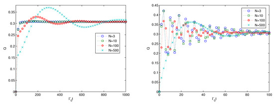 Next, we investigate the effect of the size N of the additional harmonic oscillators on the multipartite entanglement generation, and the results are presented in Figure 4. From the left subfigure in Figure 4, the multipartite entanglement evolution increases to stable a stable value, accompanied by some oscillations. The larger the size of N is, the larger the oscillation is, and the larger the quasi-period. The oscillating behavior characterizes the non-Markovian dynamics of the quantum states. For the strong coupling in the left subfigure, the quasi-period is far shorter than that for the weak coupling, and the multipartite entanglement reaches the stable value faster than that for the weak coupling. The results in Figure 4 imply that the large size of the additional harmonic oscillators contributes to the non-Markovian dynamics of the quantum entanglement. The effect of the size of the additional harmonic oscillators is similar to that of the coupling strength between the 0th harmonic oscillator and the N additional harmonic oscillators to a large extent due to the term of multiplication in Equations (10)–(13). Therefore, the similar effect of g and N is not surprising.