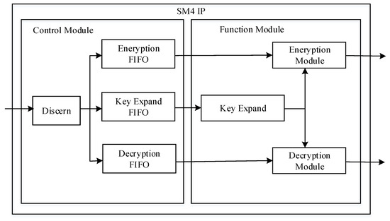 The SM4 encryption IP core module is divided into two modules: the control module and function realization module. The internal design block diagram of the encryption module is shown in Figure 2. The control module is divided into the analysis module, the storage module, the function realization module, which is a key expansion module, the encryption module, and the decryption module.