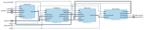 The internal block diagram of the decryption module is shown in Figure 5. The decryption module reads the 32 wheel keys from the subkey storage module rk_ram_en and participates in the iterative operation of the decryption module decryption. The 32 decrypted child plaintexts are stored in plain_ram, and the final plaintext synthesis module plain_result reads the last four wheels of plaintext and reverses them into the final plaintext data.