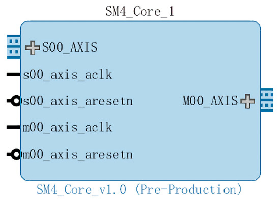 After we implement the two major modules of control and function in the encryption core, the last thing to do is to encapsulate the SM4 encryption module into a complete IP core, as shown in Figure 6, and call it in the system design. This is because inter-communication uses the AXI bus protocol, so we encapsulate the encryption core into a module with an AXI interface and call it in the system.