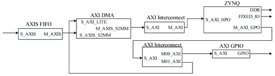 For the setting of the clock module, first, the differential clock is connected to the utility buffer IP through the pcie sys_clk external interface, and the reference clock frequency is set to 100 MHz. We use XDMA’s sys_clk interface to input the clock signals to allow it to generate its own internal clock and provide external output clock signals. The clock domain of AXI4 is output from the axi_aclk clock interface on the other end of IP. Other IP cores with AXI interfaces on the PL-side provide the clock. The PL (Progarmmable Logic)-side PCIe (Peripheral Component Interconnect express) module design diagram is shown in Figure 3.