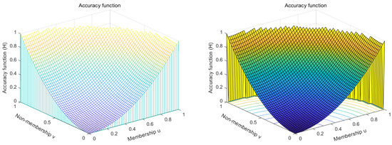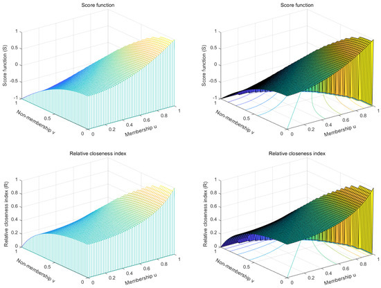 Score function (S), relative closeness index (R), and accuracy function (H) are drawn in Figure 1 all over PFN domain. Co-domains of score function (S), relative closeness index (R), and accuracy function (H) are defined as