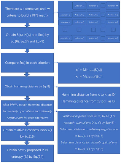 Based on accuracy function (H), the score function (S), revised relative closeness index (), and the basic idea of Shannon entropy, PFN entropy with a TOPSIS method is proposed as