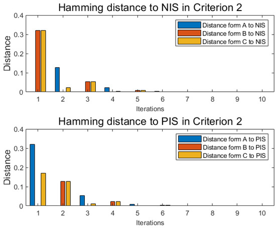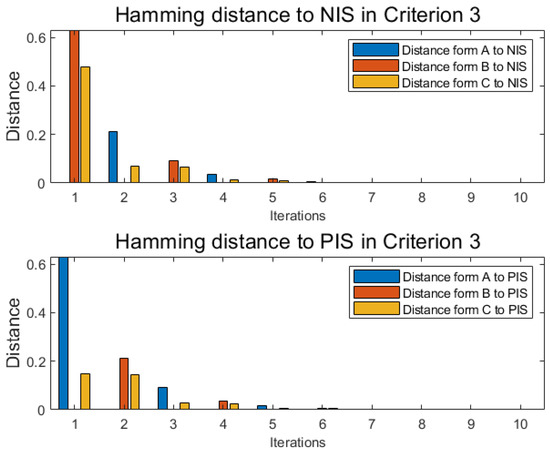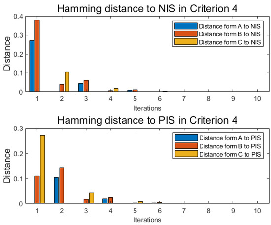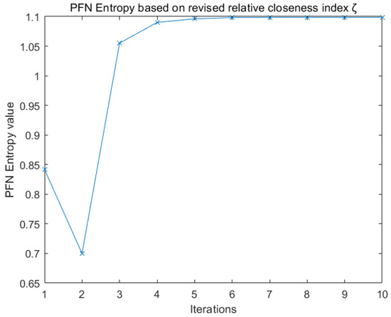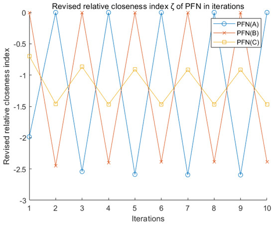 Since the revised relative closeness index () is always less than or equal to zero in the PFN negation iterations, whereas score function (S) converges to zero. Meanwhile, the accuracy function (H) is dramatically reduced. Therefore, at the macro level, his degree of ambiguity is increasing in the process of PFN negation iterations. One of the great advantages of the revised relative closeness index () is that it no longer regards PFN (0, 1) and (1, 0), as a reference for NIS and PIS to calculate closeness index. In each process of calculating , only the relatively worst and optimal alternatives ( and ) under this criterion are regarded as NIS and PIS. Therefore, does not converge in an exact direction in the PFN negation. Instead, will periodically oscillate in Figure 10. In summary, it is indeed of vital significance to use the score function as the weighting factor of the closeness index ().