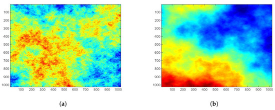 For illustrative purposes, we simulated 2D fractional Brownian fields with size and H ranging from 0.1 to 0.9. Figure 1 represents two simulated 2D fractional Brownian fields with and , respectively. For each simulation, we estimatd the Hurst parameter H and wavelet-based Shannon entropy using wavelet Daubechies 6. The boxplot represented in Figure 2 shows the distribution of the Hurst parameter estimation for each value of H (for ).