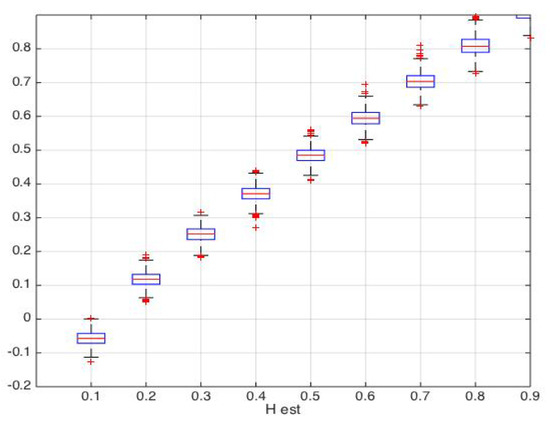 Boxplots of estimated Hurst parameter for each H parameter (). Dashed line, identity.