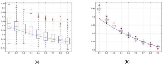 Boxplots of theoretical wavelet-based (a) Tsallis and (b) Rényi entropies using estimated Hurst parameters. Dashed line, theoretical Tsallis () and Rényi () entropies, respectively, for and .