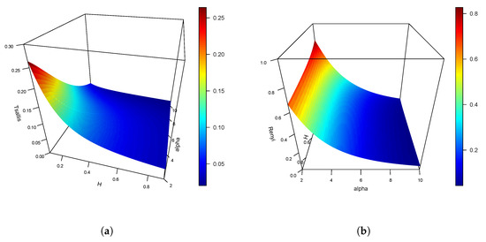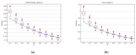 Additionally, we estimated wavelet-based Tsallis and Rényi (for ) entropies for the simulated 2D fractional Brownian fields (Figure 4a,b, respectively) and we compared them with their theoretical values for each H (with ). These plots show that Tsallis and Rényi entropies both decreased with higher values of H. However, more robust methods have to be used for estimating Hurst parameters when H is very small (for example, for ), since the wavelet method seems to underestimate real values, hence affecting the estimation of entropy measures. Since the result of this work allows to estimate entropy measures independently of the used wavelets, a different method could be used for estimating the Hurst parameter. In Figure 5a,b, we show the different behavior of Tsallis and Rényi entropies, respectively, for different values of