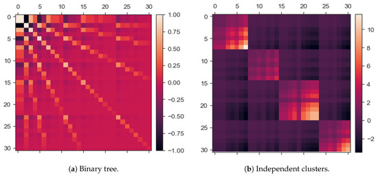 Covariance matrices of the two data sets considered. In (a) the variables involved in the covariance computation are all the nodes of the tree structure, from the root node to the leaves. In (b) the variables involved are all those constituting the graph in Figure 3. Note that in covariance matrices it is not granted that the elements range in . In fact, the features of the tree-generated data attain values among , while in the clusters data set, the random variables involved in the covariance computation attain their topological ordering values. The labels of the features range between 0 and 30, meaning that there are 31 features overall, in both the data sets.