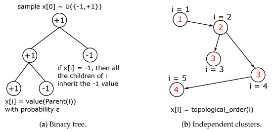The binary tree data set is thought as a slight modification of the generative model illustrated in Reference [16]. This data generator is designed to create data instances displaying a hierarchical structure, as shown in Figure 1a. Each generator run produces a data instance, whose features attain values among . The initial feature (root node) is sampled uniformly and its value diffuses through the tree branches. The rationale underlaid is as follows: If the root node attains the value , then the left child inherits the value and the right child (together with all its progeny) is assigned the value . Contrarily, if the root node happens to be , then the right child inherits the value. From the root node children on, the criterion is probabilistic. One of the children of a node inherits the same value with probability , that is a threshold set a priori to (see Figure 2a). Clearly, the smaller this threshold, less likely is the value to flip. To perform such a stochastic flip, for each node one samples a value p uniformly distributed in . For example: a node i has the value . Given , sample . If , then the left child of i (which has the node index equal to , where the root node number is (Note that the node number is not the value stored in such node. This latter may be or while the former ranges from 0 to the total number of nodes . refers instead to the depth of the tree, that is, how many node levels it has. Note that a linear array storage is used for the binary tree data structure). ) inherits the value and the right child instead inherits . If , the left child inherits and the right child inherits . The features of each data sample are the collection of all the nodes in the tree structure for a given generator run, with the first feature being the root node, the right and the left children contain the second and third features respectively and so forth.