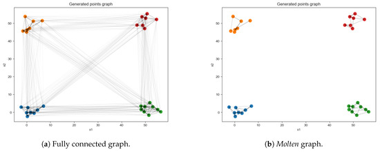 Once points are generated, are turned in a fully connected graph, that is, create edges between each pair of nodes. In the spirit of the simulated annealing algorithm, here it is imagined that such a fully connected graph is a sort of mineral structure, and it is to increase the temperature, to simulate a melting process that destroys some of the over-abundant edges, according to some metric, for example, the distance between points. For this reason, it comes handy the 2-dimensional representation: Distance is simply the norm of the vector from a node to another. The distance for which the edge is removed is temperature-dependent: the higher the temperature, the shorter the maximum edge length allowed. At the end of this simulated melting process, it is expected the graph to exhibit some independent components, provided the melting schedule is properly set. Moreover, these independent groups are not fully connected within themselves. The melting schedule is designed in a way to remove some of these intra-edges. This simulates the random variables of each group not to be dependent on all of the others in the same could. Note that, unlike how exposed in Reference [19], in this melting simulation there is not, strictly speaking, a optimization perspective inasmuch what matters is the removal of some edges. The physics of the procedure could be improved.