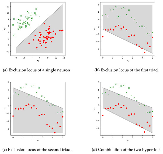 Given these analogies between biological transduction networks and artificial neural networks, it is legitimate to hypothesize that information processing in both classes of systems might be carried out using similar computational structures. Reference [9] argues that “Multi-layer perceptrons allow even relatively simple units to perform detailed computations in response to multiple inputs. The deeper one goes into the layers of perceptrons, the more intricate the computations can become”. If one thinks of “intricate computations” as the computation of appropriate decision boundaries, then this task is precisely what is accomplished by multi-layer perceptrons. Individual neurons (absorbing an arbitrary length input) could only discriminate two classes, as in Figure 5a (in this case one has only two input features), but stacking together multiple layers of neurons allows to create more intricate and complex decision loci in the input space, as in Figure 5d. Panels Figure 5b–d refer to the combination of two triads as in Figure 5a, assembled so to form a simple neural network with two input neurons and two output units, with no hidden layers. Figure 5b is the exclusion locus of the triad formed by the input units and the first output unit, Figure 5c analogously refers to the triad in which the output unit involved is the second one. This trivial example shows how hyper-planes designed by simple groups of units arrange to identify less obvious exclusion hyper-subspaces and note that stacking more layers one can go beyond straight lines.