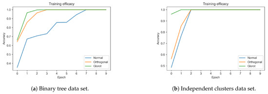 Efficacy of initialisation schemes for (a) binary tree and (b) independent clusters data sets. Note that the orthogonal matrices initialisation grants the best performance in terms of training speed and note also that the independent clusters environment is easier to be learned, likely owing to its statistical sparsity.