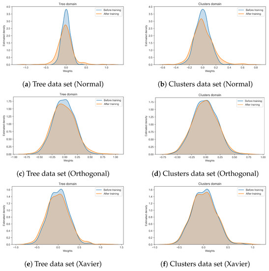 Figure 7 shows how the weights distribution changes during the course of learning. As noted in previous studies [17] the effect of learning is mostly evident in the tails of the distributions and, in our simulations, especially for the Normal initialization scheme. This suggests that the Orthogonal and Xavier initializations might help building more effective motifs since the beginning, by imposing a stronger bias to the initial structure of the network. A statistical analysis revealed that, indeed, although after learning the weights became larger in absolute value for all the initializations and data sets considered (see Table 2), such difference was significant only for the network initialized using the Normal scheme and trained on the tree data set (). Figure 6 depicts how the normal initialization scheme renders a slower convergence. This points out that the correlation between the initial distribution and the evolved distribution in the case of normal initialization decreases, implying also a decreased correlation in the motifs significance profiles, see Figure 8d.