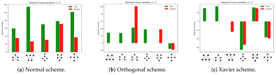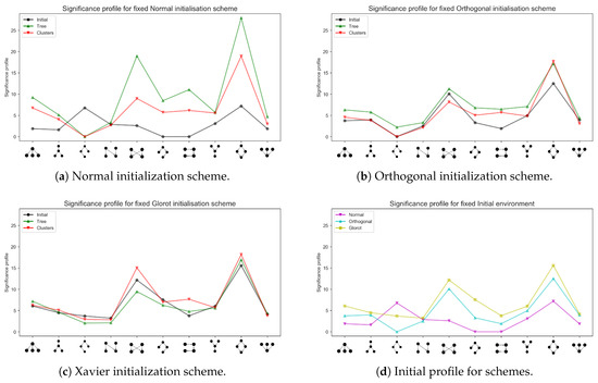 Figure 8 shows the overall trend of change for the most common 4-nodes motifs: The x-axis gathers the motifs prototypes, the respective y value is the significance score, obtaining a significance profile (Note that significance scores are sometimes normalized, allowing to superimpose (and thus compare) significance profiles referred to different instances of a complex network [27]. However, in the present work normalization is avoided, since the network inspected (hence the size of the system) is the same for all the analyses. Non-normalized scores also allow to better understand the magnitudes of the detected effects.). As evident by comparing Figure 8a–c, the significance profiles resulting from different initialization schemes display a remarkable self-similarity, suggesting that this set of basic structures might support information processing in all the data sets considered. Interestingly, several of such motifs are also consistent with those commonly found in biological transduction networks (the fifth and the ninth motifs from the left), suggesting a potential overlap of computational mechanisms. The fundamental feature of the analogy is the identification of an hyper-plane which classifies the nature of a given input—which comes as a weighted sum, in both transduction and neural networks. As mentioned above, the amount of change in the weights seems to be correlated to the change in the significance profiles—in the case of Normal initialization, the variation is most severe, while in the other two cases the significance profile seem to be already biased before learning takes place.