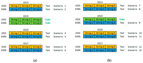 As described before, one of the most important procedures to take place is the selection of the samples to include in the training dataset. This training data selection process is part of the machine learning data mining methodology that is used in this work, as described in the introduction Section. In order to understand what number and what types of samples to include in the training dataset for the machine learning regression model to generalize well to new unseen data (testing dataset) and provide the most accurate prediction outputs, Experiments 1 and 2 were devised as illustrated in Figure 1. All the historical data are divided into two groups namely the “ODD” strings (orange) and the “EVEN” strings (blue) and each of these groups is associated with a year and a dataset (training or testing). In Experiment 1 the 2015 “ODD” and “EVEN” PV string historical data (6 PV strings with 186 samples) were used for the training dataset (green) while all the other historical data were used for the testing dataset. In Experiment 2 only the 2015 “ODD” PV string historical data (3 PV strings with 93 samples) were used for the training dataset, while all the other historical data were used for the testing dataset. This dataset size (93 samples) has been proven to be adequate to provide accurate machine learning model results as described in [7] and in [12].