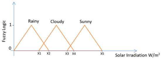 Illustration of a Fuzzy Logic System that associates ranges of solar irradiation values with weather conditions such as rainy, cloudy and sunny days.