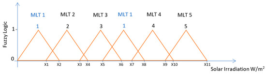 The fuzzy system used in this work is a single input and a single output Takagi-Sugeno fuzzy logic inference system. The output can only take 1 of 5 integer values that correspond to the MLT solution that is most appropriate as illustrated in Figure 3. Therefore, the regression tree is associated with the fuzzy output 1, the artificial neural network is associated with the fuzzy output 2, the multi-gene genetic programming is associated with the fuzzy output 3, the Gaussian process is associated with the fuzzy output 4, and finally the support vector machines for regression is associated with the fuzzy output 5. The advantage of this fuzzy system compared to the previous one illustrated in Figure 2, is that the same machine learning technique can be associated to different ranges of solar irradiation values, whereas in the previous fuzzy system the sunny day classification could only be used in a specific range of solar irradiation values.