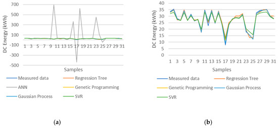 Predictions of PV string 1 in 2014 (a) All five machine learning techniques (b) All machine learning techniques except for ANN