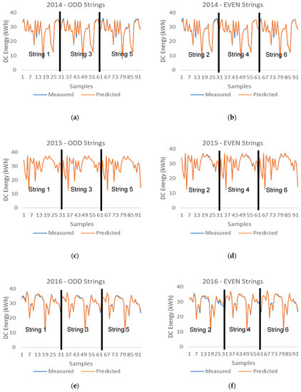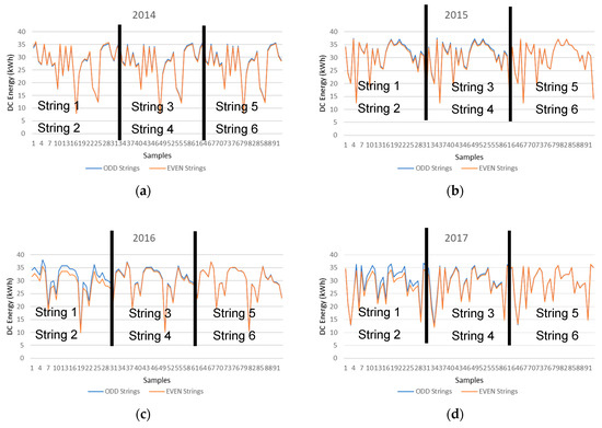 The four graphs presented in Figure 8, illustrate the PV string DC energy production of the ODD and EVEN strings in the different years of July. When analyzing the results from the ODD and EVEN strings of the year 2014, it is verified that they are very similar to each other and therefore indicate that all strings are producing solar energy in a similar way. However, this production similarity does not take place in the years 2016 and 2017. It is clearly noticeable that the production in String 2 is lower compared to String 1 in years 2016 and 2017 when compared to the years 2014 and 2015, and therefore a deviation between the prediction values of the neighboring PV strings indicate that a PV system fault has been detected since this deviation does not take place in previous years.