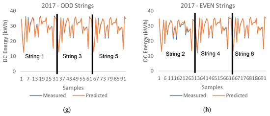 DC energy measured vs. predicted data provided by the hybrid system (Fuzzy + 5MLTs) (a) 2014 ODD PV Strings (b) 2014 EVEN PV Strings (c) 2015 ODD PV Strings (d) 2015 EVEN PV Strings (e) 2016 ODD PV Strings (f) 2016 EVEN PV Strings (g) 2017 ODD PV Strings (h) 2017 EVEN PV Strings.