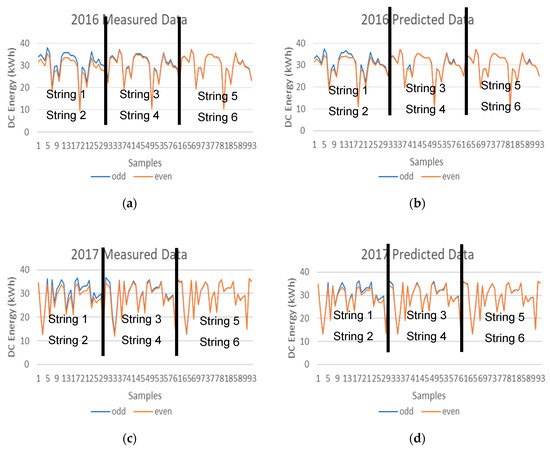 DC energy values of the ODD and EVEN PV strings (a) 2016 measured data (b) 2016 prediction data (c) 2017 measured data (d) 2017 prediction data.