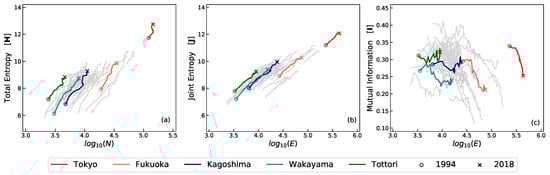 Entropy and mutual information prefectures in Japan between 1994 and 2018. Plot (a) shows the evolution of the total entropy H as a function of the total number of companies (nodes) during the period 1994–2018. Similarly, plots (b,c) show the equivalent joint entropy J and mutual information I as a function of total number of edges E. Each grey line represents the path taken single prefecture in Japan during the period 1994–2018. The coloured lines highlighting representative prefectures, selected from the largest (i.e., Tokyo) to smallest (i.e., Tottori) in terms of GDP (gross domestic product) and maintaining similar ranking intervals in between (Fukuoka, Kagoshima, and Wakayama). The circles point to the year 1994 whereas the x-cross relates to 2018.