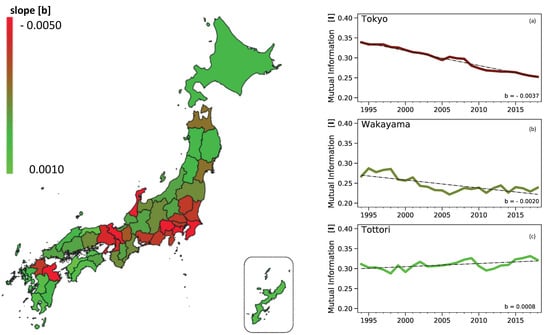 The heatmap of Japan within Figure 2 shows the geographical distribution of the average rate of decline () or increase () to the mutual information I over the period in study, 1994–2018. It is easy to visualise that the highest rates of declines (i.e., red areas) are almost totally associated with the prefectures and urban conurbations of Japan’s largest cities, with the sole exceptions of (a) Sapporo, a large city in a very large rural prefecture (Hokkaido) and (b) Oita where no immediate explanation can be found. In a consistent manner, the lowest rates of decline (or slight increase) are associated with the smallest prefectures, in economic terms as measured by the GDP, such as Tottori and Ehime. These results suggest that a time series analysis of the evolution of the mutual information provides a measure (the linear slope ‘b’ or the average changes to I), which reflects the level of the economic activity, or urbanism, for a given region. Essentially this approach can be feasibly used to potentially define economic clusters and conurbations in a quantitative manner through a single unit measure.