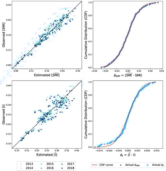 Observed and estimated values for the structural mutual information and total mutual information I for the years 2013–2018. The top left panel shows the comparative results between the values observed for structural mutual information (or as described within Methods) on the y-axis against those estimated by making use of Equation (11) on the x-axis. Each dot consists of a single prefecture within Japan at a specific year, with years colour mapped from lighter to darker shades, older to the most recent. The diagonal line represents the point where . Similarly, the bottom left panel shows the observed mutual information I on the y-axis, calculated in accordance with Equation (7), against those estimated by the model by making use of Equation (12) on the x-axis. On the right side, the differences between the estimates to the actual values (x-axes) are ranked and plotted against the cumulative function of a normally distributed curve as shown by the red lines.