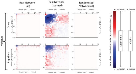 Pointwise contribution to the mutual information, , for real and randomised networks. Each panel represents a heatmap of the pointwise contribution to mutual information for the directional edge combination ‘i’ (vertical axis) to ‘j’ (horizontal axis), calculated in accordance with Equation (8). Both axes are equal in value, consisting of the ranked sequence of the total degree distribution of companies for the relevant representative prefectures, Osaka in the top row and Kagoshima in the bottom row. The left (all degrees) and centre (zoomed degrees up to 20) panels show the contribution to the mutual information for the real network, whereas the right panels show contribution related to the randomised network. The colour maps on the right show the intensity of the contribution, with different scales by prefecture, but the same for all panels for the selected prefecture. Darker colours are associated with higher numbers with blue being negative values, red being positive, and totally white being zero.