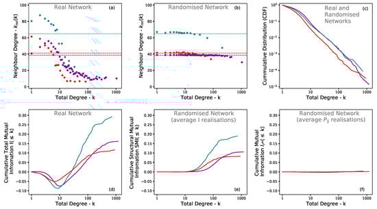 From an information theory perspective, it follows that an amount of mutual information will always be different from zero if the network is disassortative, simply as a result of the functional forms of entropy and mutual information. Therefore, within our framework, it is possible to break the computation of the mutual information into two separate but related components: The structural mutual information, , and the total mutual information, I. The former solely relates to the degree distribution of the nodes within a given network, whereas the latter encompasses both the node degree distribution as well as the disassortativeness of the network.