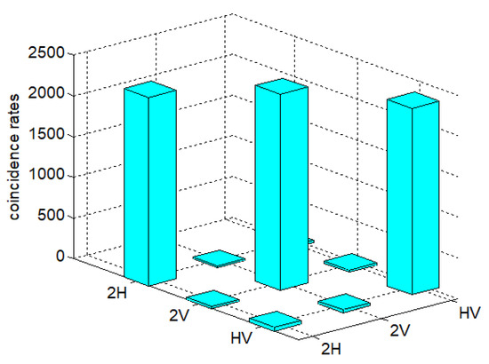 As mentioned above, the experimental verification of the information entropy inequality, especially the high-dimensional information entropy inequality, is very demanding on the fidelity and brightness of the entanglement state. Therefore, we adopted a variety of technologies to improve the fidelity and brightness of the prepared four-photon entangled states: Firstly, we achieved and maintained a constant temperature, constant humidity, and constant mechanical vibration environment for a long time to reduce the fluctuation of laser pumping power. Secondly, we used the optical feedback loop structure to make the ultraviolet pumped light pass through the BBO crystal twice to improve the brightness of the prepared entangled light source [17,18]. Due to the adoption of the feedback loop structure, the count rate of four-photon entangled states was 16 times better and an approximately intensity 7/s was achieved. At the same time, we obtained and used 150 mw as the optimized laser pump power, which can guarantee enough coincidence counts while ensuring high visibility of the quantum state. We then fine-tuned the additional combination of QWP + HWP + QWP to improve the contrast of the entanglement system, as shown in Figure 1. Finally, we got rid of the effect of device loss and dark count on measurement data. We measured the density matrix by the method of over-complete state tomography to characterize the prepared entangled states. The experimental data of nine combinations of measurement basis, , , and , were collected, as shown in Figure 2. Through the above operation, we could obtain the entangled state with a fidelity of 97.8 ± 0.2%, which could prove that the entangled system had good properties [20,21].