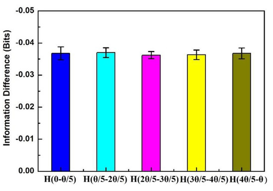 The advantage of using information entropy inequality to quantify quantum correlation is that it the amount of experimental measurement observables can be significantly decreased. Thus, according to the symmetry and rotational invariance of the experimental system, we gave the experimental results with information difference of , , , and to prove the information entropic inequality. Since we were dealing with widely separated systems, the measurement on particle A did not disturb particle B. This meant that the measurement between any pair was expressed in the form of an appropriate probability. The experimental results and experimental errors of information difference when the θ was rotated from 0 to θ/5, θ/5 to 2θ/5, 2θ/5 to 3θ/5, 3θ/5 to 4θ/5, and 4θ/5 to θ are shown in Figure 3. It can be seen that within the error range, the measurement results of these five parts were very close, and the error was likely caused by the modulation of the measurement equipment angle [20].