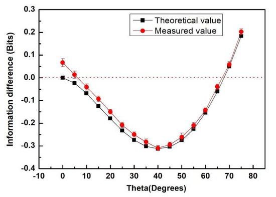 The information differences of information entropic inequality in bits depended on rotation angle θ. The measurement time of each experimental measurement point is 900 s. In order to reduce the measurement error, 50 measurements were made for each measurement point.