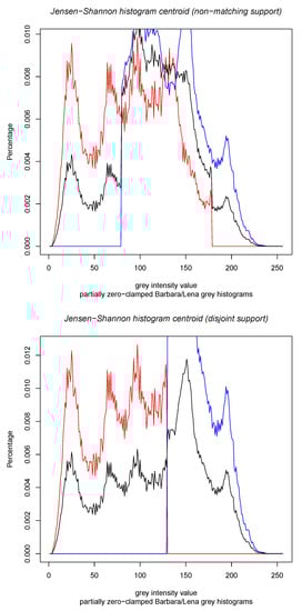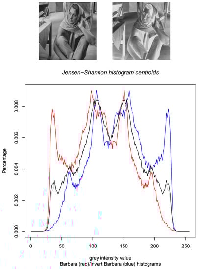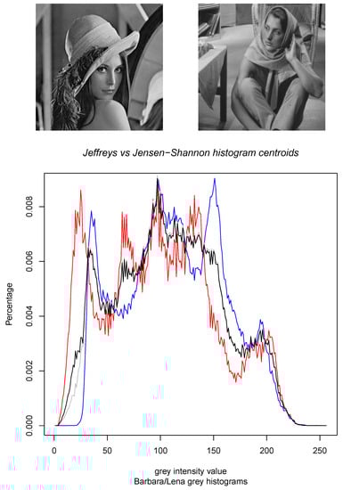 - Third, we consider the calculation of the Jensen–Shannon centroids in Section 3 for densities belonging to mixture families. Mixture families include the family of categorical distributions and the family of statistical mixtures sharing the same prescribed components. Mixture families are well-studied manifolds in information geometry [25]. We show how to compute the Jensen–Shannon centroid using a concave–convex numerical iterative optimization procedure [27]. The experimental results graphically compare the Jeffreys centroid with the Jensen–Shannon centroid for grey-valued image histograms.