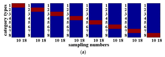 The results of the 3-bit optical packet header recognition are shown in Figure 3. The horizontal axis of each sub-graph in Figure 3 is the number of sampling points of the 3-bit optical packet headers with a length of 18. The vertical axis is the category of the optical packet headers. When the output value of the RC is closer to ‘+1’, it will be shown in red, which means that the recognition results of the optical packet header are more accurate. When the output value is close to ‘−1’, it will be shown in blue. Figure 3a presents the desired output of the 3-bit optical packet headers, while Figure 3b shows the actual recognition output. The closer both are, the better the signal recognition effect will be. As can be seen from Figure 3, the recognition results for the four-route of 3-bit optical packet headers are good. The above results are obtained with the SNR of the input signal with 20 dB. For practical applications, the SNR is generally within the range between 20 and 40 dB, indicating that the system has certain anti-noise capability.