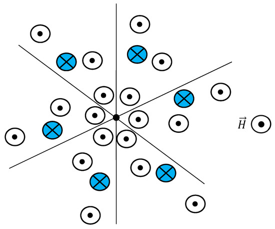 Schematic representation of a system of elementary magnets possessing axis of symmetry to the order of six, embedded into magnetic field . Magnetic moments and magnetic field are normal to the image plane. Maintaining 6-fold symmetry requires simultaneous re-orientation of six magnets (for example, re-orientation of the magnets, marked in Figure 2 with blue color).