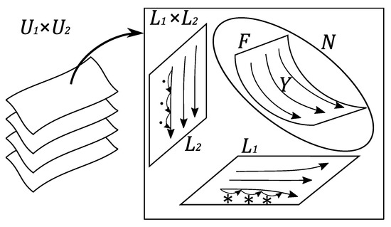 On any leaf of the primary foliation of , there is a bi-contact hypersurface N carrying the bi-contact Hamiltonian vector field Y. Because of the dimension, the surface F in the figure presents simultaneously a leaf of the secondary foliation and a leaf of the tertiary foliation of that leaf. The flow on the tertiary leaf traces the common lift of the iteration of ∗ on and the iteration of · on .