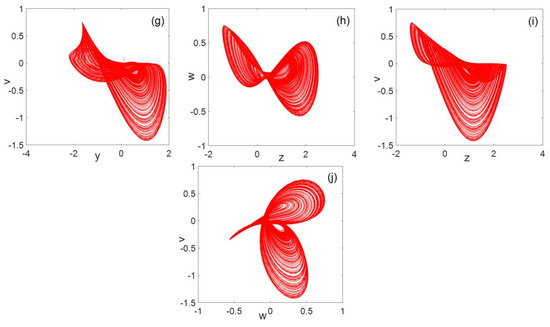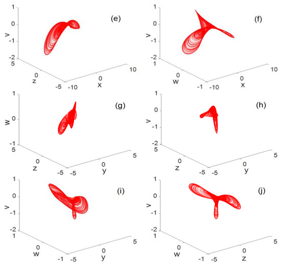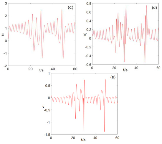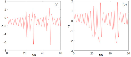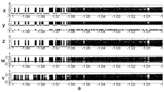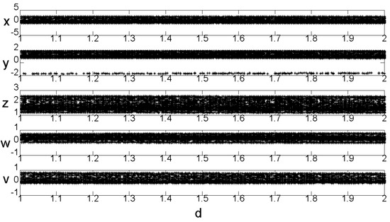 For equation parameters , , the bifurcation diagram of the change in parameter is shown in Figure 5. As can be seen from Figure 5, when the parameter , system (2) is in a chaotic state.