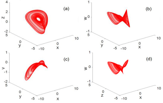 For the equation parameters , the bifurcation diagram of the change in parameter is shown in Figure 4. Figure 4 shows that, when the parameter , system (2) is in a chaotic state.