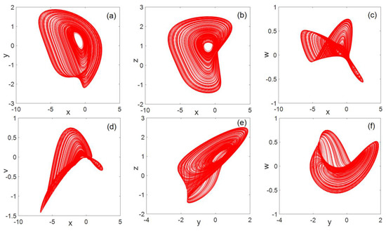 For system parameters , the 3D phase diagram generated by system (2) is shown in Figure 2. The resulting planar phase diagram is shown in Figure 3. It can be clearly seen from Figure 2 and Figure 3 that the chaotic system can generate three-leaf chaotic attractors in multiple directions.