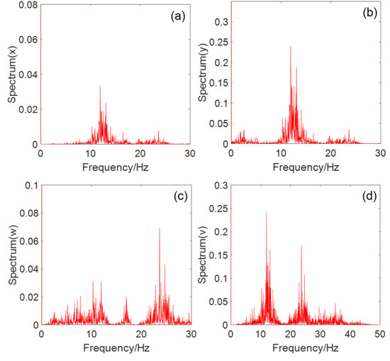 The power spectrum of the chaotic sequence is a continuum, and the calculation results of the sequence , and power spectrums of system (2) are shown in Figure 6a–d, respectively. It can be seen from Figure 6 that system (2) is in a chaotic state.