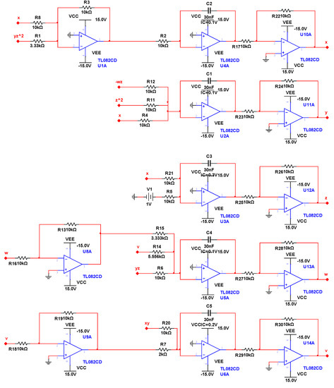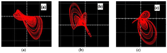In this section, we design an analog circuit, as shown in Figure 7, which is mainly composed of an inverting adder, integrator, and inverter composed of an operational amplifier TL082CD. The power supply voltage of the operational amplifier TL082CD is . This circuit has a simple structure and is easy to implement. The experimental results for this circuit are shown in Figure 8. Figure 8a shows the plane, Figure 8b shows the plane, and Figure 8c shows the plane. It can be seen from the oscilloscope that the experimental results for the circuit for the three-leaf chaotic attractor in each plane were consistent with the results of the numerical simulation experiments.