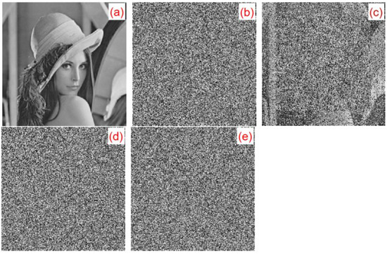 In the encryption process, we multiplied each element of the five chaotic sequences produced by 1011 and performed convolution operations with the convolution kernel of . The convolution kernel of in this algorithm was . In the decryption process, when any of the parameters in the convolution kernel were slightly changed, the original image could not be successfully decrypted. When any parameter in the convolution kernel changed slightly with , the decrypted image was blurred, but the outline could be seen, as shown in Figure 22c. When any of the parameters in the convolution kernel was slightly changed with , the decrypted image could not substantially display the plaintext image information, as shown in Figure 22d. When any parameter in the convolution kernel changed slightly with , the plaintext image information could not be solved at all, as shown in Figure 22e. Taking the Lena image as an example, we made a slight change to the parameters of the second row and the second column of the convolution kernel: , , . The plaintext images, ciphertext images, and the corresponding decrypted images of , , and are shown in Figure 22.