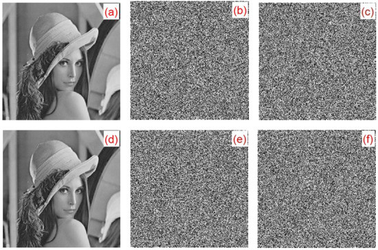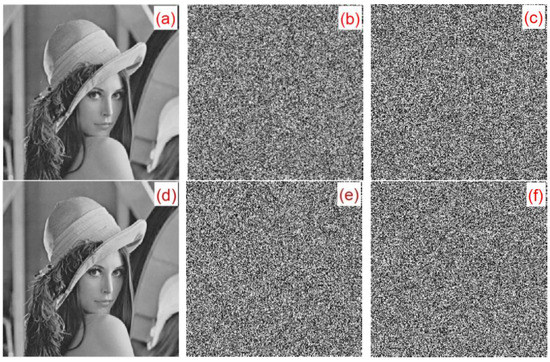 A small change in the key results in a great change in the ciphertext, which is the key sensitivity. In the experiment, the Lena image was considered as an example. Figure 24 shows the sensitivity of the algorithm to the initial key. Figure 24a is a plaintext image. Figure 24b,c show the results of using keys and for encrypted ciphertext image and , respectively. Figure 24d shows the result of the correct decryption of using . Figure 24e,f show the results of and using the wrong decryption keys and , respectively. Figure 24 illustrates that, despite only minor changes between the keys and , the ciphertext images and could be decrypted correctly using the corresponding keys and .