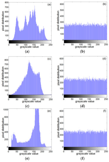 Information entropy is an important indicator of randomness, which reflects the distribution of gray values of images. The more uniform the gray value distribution, the larger the information entropy of the image. The information entropy calculation formula of an image is shown below.