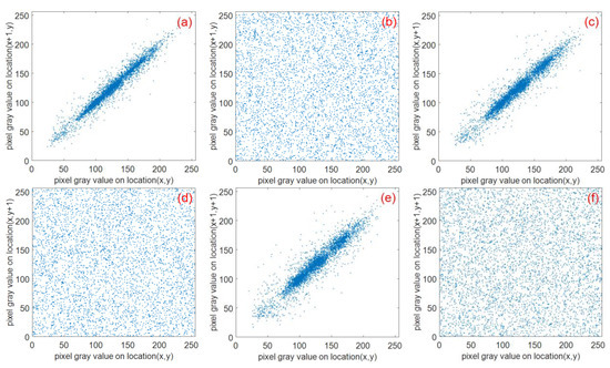 A feature of digital images is the strong correlation of adjacent pixels. To calculate the correlation of adjacent pixels before and after encryption, 5000 sets of adjacent pixels were randomly selected in the horizontal, vertical, and diagonal directions of the plaintext and ciphertext images. The horizontal, vertical, and diagonal correlation coefficients were calculated using Equations (35).